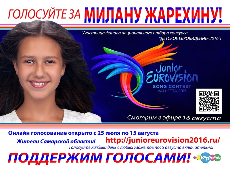 Финал национального отборочного конкурса исполнителей детской песни «Евровидение» пройдет в МДЦ «Артек» 15 августа. Телевизионную трансляцию зрители смогут посмотреть 16 августа. Милана Жарехина — представит Самарскую область в финале Национального отборочного конкурса «Детское Евровидение-2016».